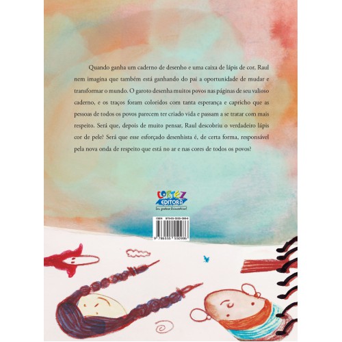 O garoto desenha muitos povos nas páginas de seu valioso caderno, e os traços foram coloridos com tanta esperança e capricho que as pessoas de todos os povos parecem ter criado vida e passam a se tratar com mais respeito.