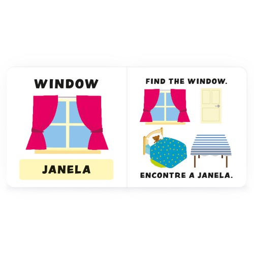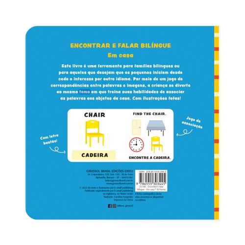 Este livro é uma ferramenta para famílias bilíngues ou para aqueles que desejam que os pequenos iniciem desde cedo o interesse por outro idioma. Por meio de um jogo de correspondências entre palavras e imagens, a criança se diverte ao mesmo tempo em que treina suas habilidades de associar as palavras aos objetos de casa. Com ilustrações fofas!